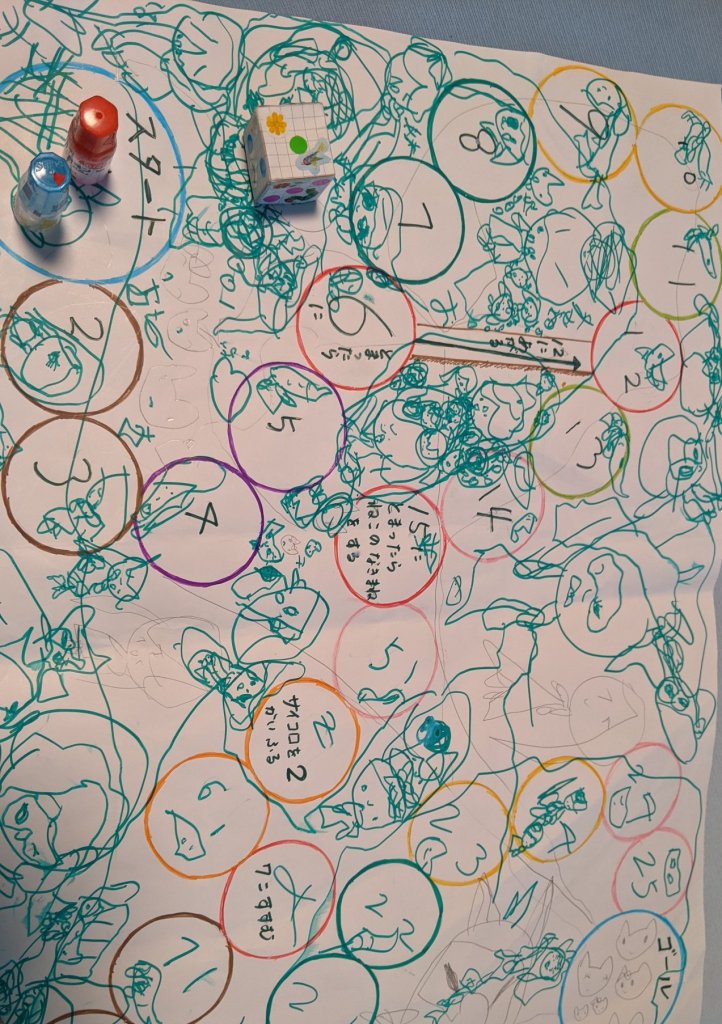 とても上手にすごろくが描けてるとおもいました。こどももすごろくのルールも理解できていたので、嬉しい😄