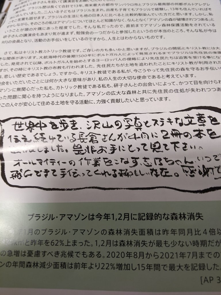 ブラジル先住民の森を守るということがテーマに当団体は活動しているのだと知りました。