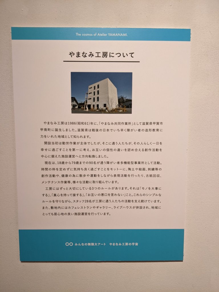 ウッドワン美術館へ 投稿者:takeshi okuda2022年8月13日カテゴリー:食べ物、勉強、博物館めぐり、地域おこしタグ:美術館博物館めぐり、広島の飲食店、広島県 行ってきました。特別展やまなみ工房の宇宙展を見たくて。 社会福祉法人やまなみ会様 作品の撮影はオッケーとのことでした 知的障がい者のスポーツの祭典スペシャルオリンピックス広島のポスターも並んでました 福祉と芸術は違う夢を見る。 本日はこのようなイベントがありまして、美術館を割引でみれました 和風カレーライスを初めて食べました。見ての通りのスゴイボリュームでした。 #廿日市市 #ウッドワン美術館 共有: X で共有 (新しいウィンドウで開きます) X Facebook で共有 (新しいウィンドウで開きます) Facebook いいね 読み込み中… 関連