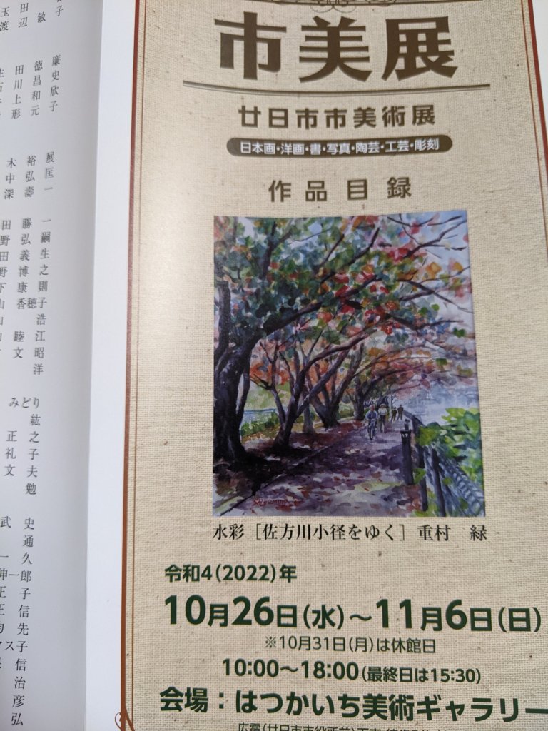 主催は廿日市市、廿日市市教育委員会さんの第59回市美展。自分も洋画、写真、陶芸とかができるようになったら、カッコイイだろうなとおもいます。まず継続するくらい好きになれるかどうかもとても重要だと思います。まずは、そこから(笑)