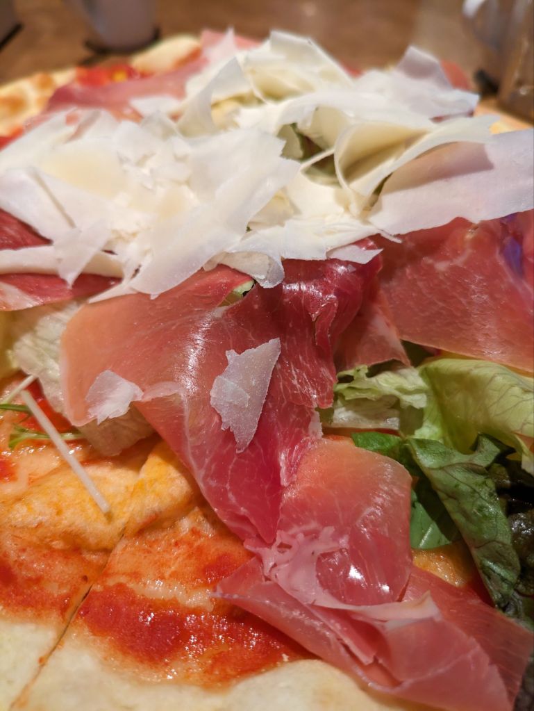 最近はジョリーパスタにもアプリがあり、そのアプリクーポンがお得なので、ありがたく使用させてもらってます。初めての生ハムサラダピザは、シーザードレッシングも付いてますのでお好みの量をかけて食べれるという食メモメモ。
